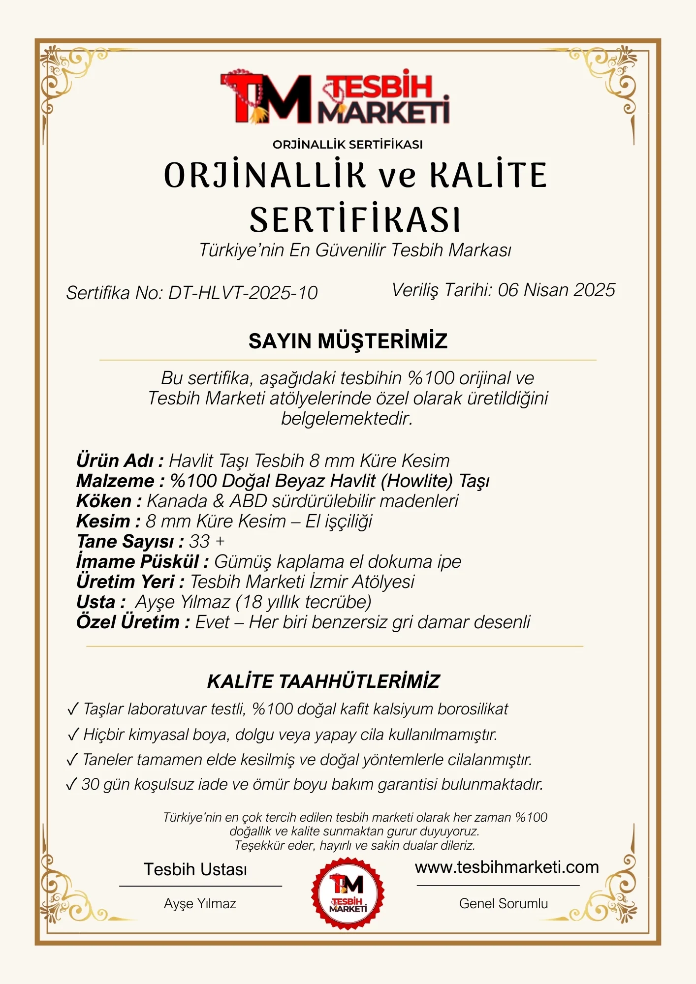 Türkiye’nin en çok tercih edilen tesbih marketi olarak 30 gün iade ve ömür boyu bakım garantisi veriyoruz. Hızlı sipariş için WhatsApp 0 544 473 22 15